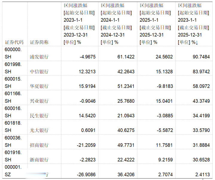 2023年至2025年,在银行股上涨的背景下,Wind数据显示,42家A股上市银行中,浦发银行、中信银行的股价上涨幅度分别91%、84%,处于上游位置。